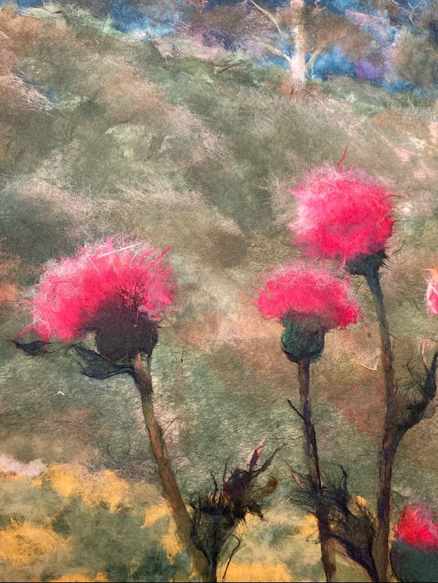 ちぎり絵草原のアザミは、美しい自然の風景を再現したアート作品です。手でちぎった和紙を組み合わせて作られたこの作品は、繊細でありながらも力強い印象を与えます。草原に咲くアザミの花が風に揺れる様子が、まるで目の前に広がっているかのように感じられます。
